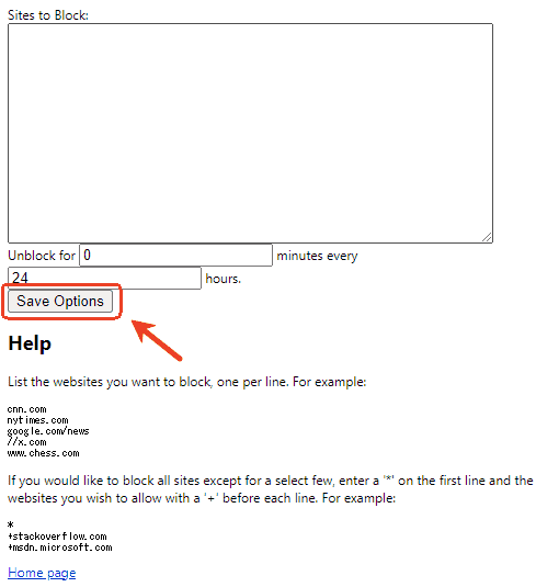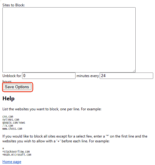 5. 下記のページが表示されます。「Sites to Block」にアクセスを制限したいサイトのURLを追加して、「Save Options」をクリックすればOKです。