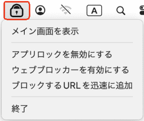3. メニューバーにCisdem AppCryptのアイコンが表示されます。アイコンをクリックして、「メイン画面を表示」をクリックして、パスワードを入力すれば、Cisdem AppCryptのメイン画面に入り、サイトブロックとアプリロックの設定を行うことができます。