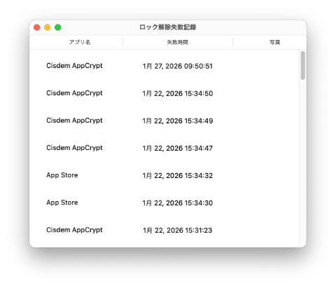 9. 右上隅の「メニュー」ボタンをクリックすれば、設定をエクスポートしたりインポートしたりできます。また、ロック解除失敗記録も確認できます。写真を撮る権限もAppCryptに与えれば、ロック解除失敗した時の写真も撮ります。