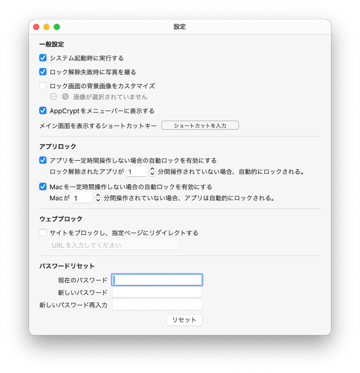 10. 右上隅の「設定」ボタンをクリックすれば、設定画面に入り、いろいろカスタマイズできます。「AppCryptをメニューバーに表示する」からチェックを外せば、AppCryptを隠し、他人に気づかれないようにすることができます。他にも、アプリの自動ロックや、リダイレクトするページの変更などもできます。