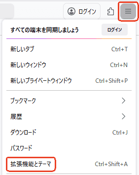 1. Firefoxを起動します。アドレスバーの右にある三本線アイコンをクリックして、「拡張機能とテーマ」をクリックします。
