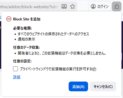 4. 「追加」をクリックします。必要に応じて「プライベートウィンドウで拡張機能の実行を許可する」にチェックを入れます。