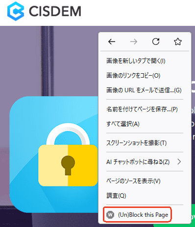5. ブロックしたいサイトにアクセスして、任意のところで右クリックし、「Block this Page」をクリックします。