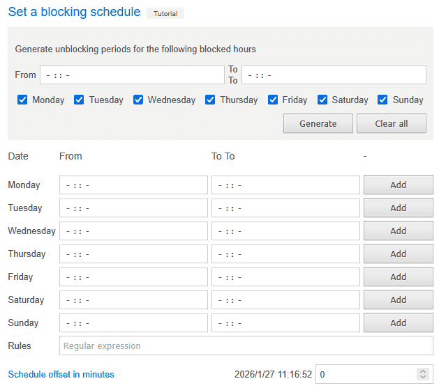 「すべてのサイトをブロック」機能を有効にしている場合、一般スケジュールで設定した時間帯以内ではすべてのサイトがブロックされます(「常に許可」リストにあるサイトを除く)。