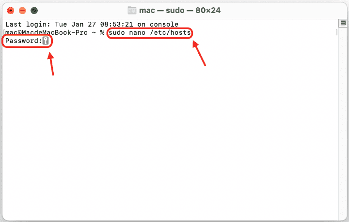 2. 「sudo nano /etc/hosts」を入力して、Enterキーを押します。