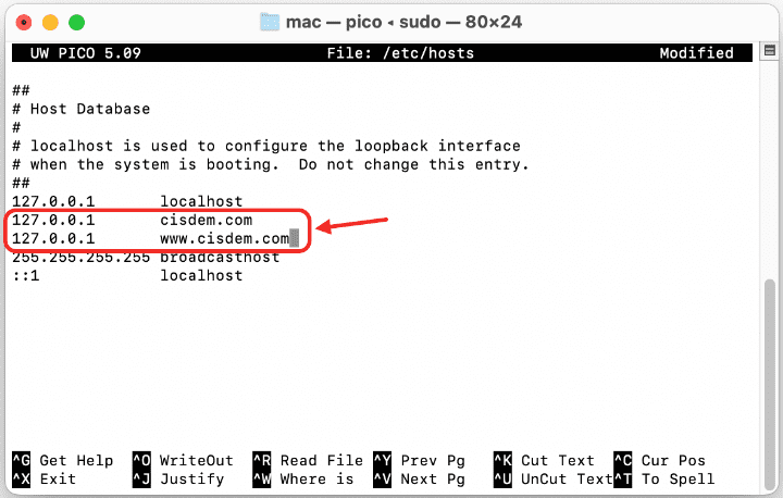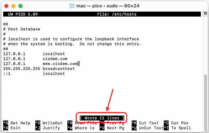 ブロックを解除したい場合は、同じ手順でhostsファイルに入り、「127.0.0.1 XXXX.com」を削除して、Ctrl+Oキーを押して、Enterキーを押せばOKです。