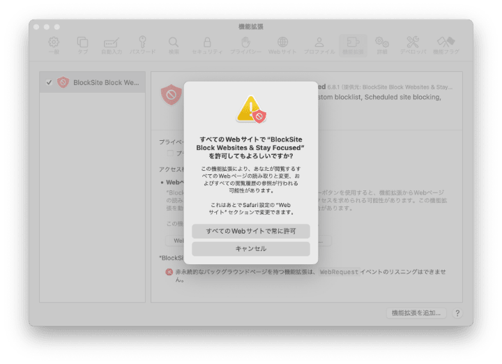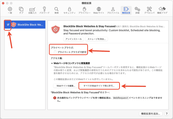 4. Safari機能拡張設定画面が開きます。左カラムでBlockSiteを見つけ、チェックを入れて有効にします。