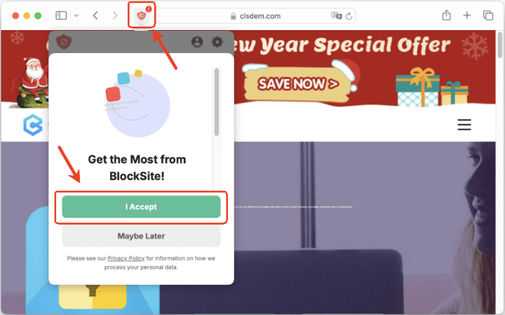 6. Safariメイン画面に戻ります。URL欄の左にBlockSiteのアイコンが表示されます。クリックして、「I Accept」をクリックします。