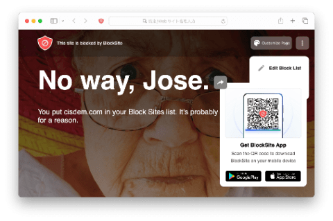 7. そしてもう一度BlockSiteアイコンをクリックして、「Block this site」をクリックして、現在アクセスしているページをブロックします。あるいは「Edit block list」をクリックして、ブロックリストでアクセスを禁止したいサイトを追加します。