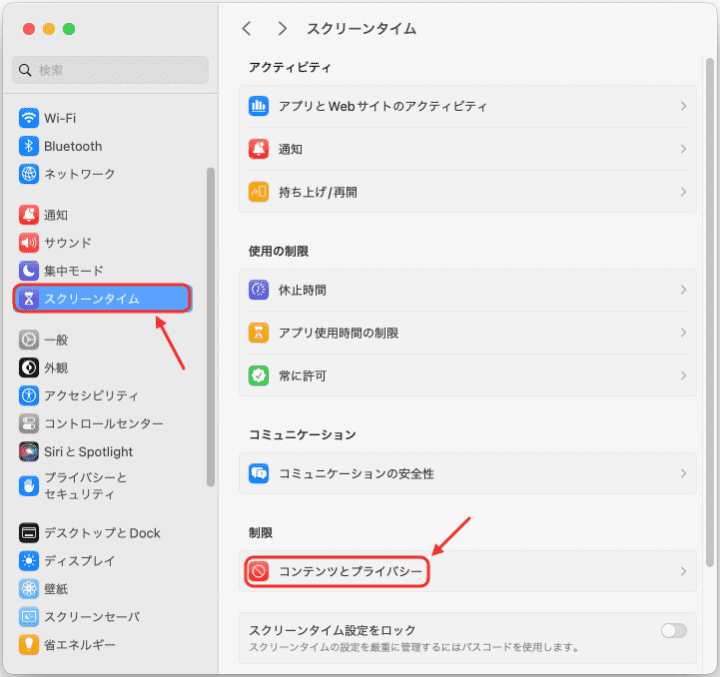 1. 「システム設定」でスクリーンタイムを開き、「コンテンツとプライバシー」に入ります。
