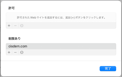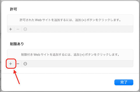6. 一部の成人サイトもブロックされますので、必要に応じてアクセスしたいサイトを許可リストに追加しましょう。そして「完了」をクリックします。