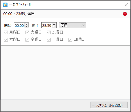 スケジュールは既定で「00:00 - 23:59、毎日」になっていますので、Cisdem AppCryptは既定でリストにあるアプリやサイトをずっとロック/ブロックします。特定の時間帯や曜日でしかアプリロック/サイトブロックを行いたくない場合は、スケジュールを変更しましょう。全てのアプリとサイトを管理する「一般スケジュール」と、特定のサイトやアプリを管理するスケジュールがあります。