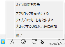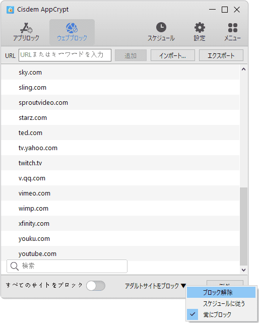 注意:「常にブロック」と「常に許可」リストにあるサイトはスケジュールで管理されません。また、Windowsの右下のタスクバーでAppCryptのアイコンを右クリックし、「ウェブブロッカーを無効にする」をクリックした場合も、スケジュールが無効になります。