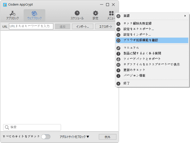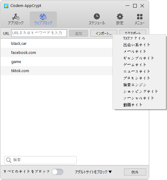 Cisdemは、ブロックリストのほかに、「例外」機能と「すべてのサイトをブロック」機能も提供しています。
