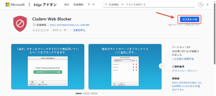 Edgeの後ろの「インストール」ボタンをクリックして、Edgeの拡張機能追加ページに入ります。「インストール」をクリックして拡張機能をインストールします。