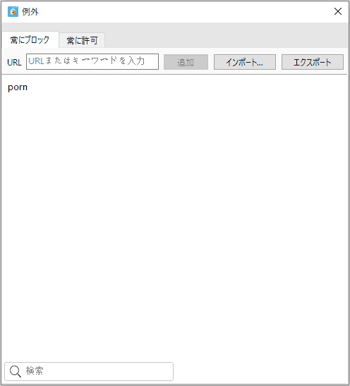 URLにとあるキーワードを含んだサイトを全てブロックしたい場合は、そのキーワードを入力して、「追加」をクリックしてください。