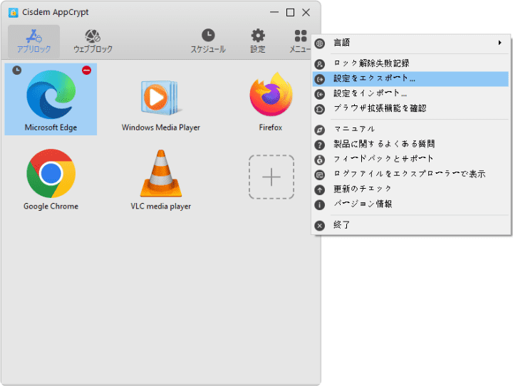 新しいパソコンに移行したい、あるいは複数のパソコンで同じアプリをロックし、同じサイトをブロックして、同じスケジュールを設定したい場合、設定のエクスポートとインポートを利用しましょう。