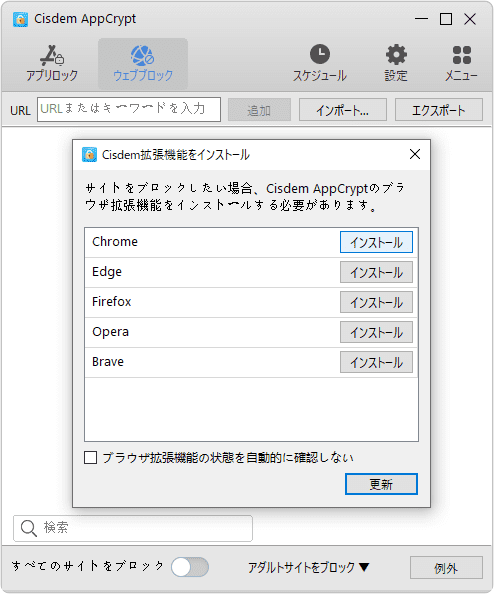 Cisdem AppCrypt windows版でウェブサイトをブロックするには、ブラウザの拡張機能をダウンロードする必要があります。まだブラウザの拡張機能をインストールしていない場合、Cisdem AppCryptの「ウェブブロック」タブに入ると、ポップアップウィンドウが表示されます。そのポップアップウィンドウで「インストール」をクリックすれば各ブラウザの拡張機能をダウンロードできます。(CisdemはChrome、Edge、Firefox、OperaそしてBraveでサイトをブロックすることができます。)