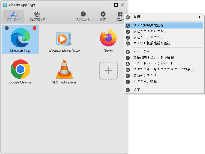 パスワードを間違えて、ロック解除失敗したとき、Cisdem AppCryptは解除しようとしたアプリ名と失敗時間を記録します。「メニュー」>「ロック解除失敗記録」をクリックして記録を確認できます。