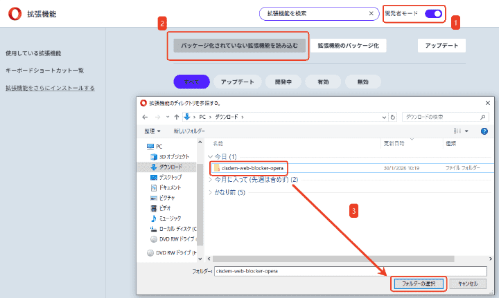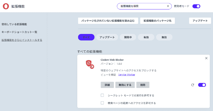 「開発者モード」を有効にします。そして「パッケージ化されていない拡張機能を読み込む」をクリックして、「cisdem-web-blocker-opera」フォルダを選択してアップロードします。