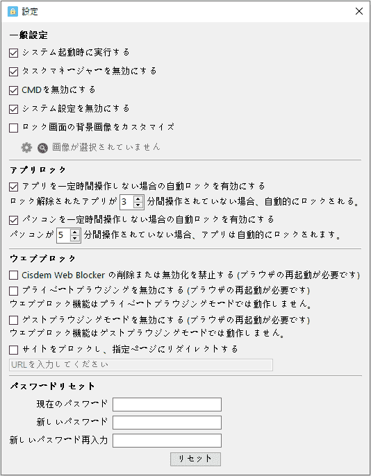b. タスクマネージャー/CMD/システム設定を無効にする: Cisdem AppCryptがさらに安全に、効率的に動作できるように、3つのセキュリティアプリ「タスクマネージャー」「CMD」「システム設定」をロックします。この3つのアプリにロックをかけたくない場合は、チェックを外してください。