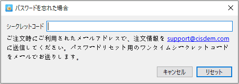ライセンスキーを購入する際に使用した電子メールで注文情報をsupport@cisdem.comに送信し、シークレットコードを取得します。そして「忘れた」をクリックして、シークレットコードをテキストボックスに貼り付け、「リセット」をクリックします。これでパスワード変更画面に入れます。