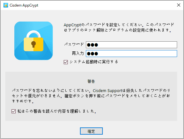 初めてアプリを起動する際に、パスワードを設定するためのポップアップウィンドウが表示されます。Cisdem AppCryptのメイン画面や、ロックされたアプリを開く際にパスワードが必要ですので、ぜひパスワードを忘れないでください。