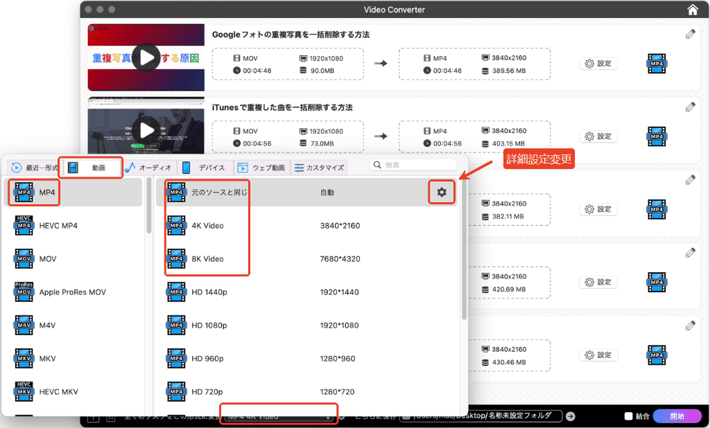 5. 全て設定完了後、メイン画面に戻り、右下隅の「変換」ボタン(Windows版の場合は「開始」)をクリックして、MOVをMP4に変換します。複数のMOVファイルを一つのMP4ファイルとして出力したい場合は、「結合」機能を有効にしましょう。