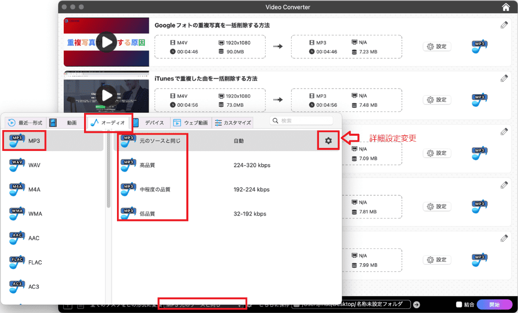 設定完了後、右下の「変換」(Windows版の場合は「開始」)をクリックして、MP4をMP3に変換し始めます。