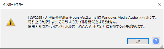 ですが、WMAファイルをAudacityに追加する場合、下記の警告が表示されます。