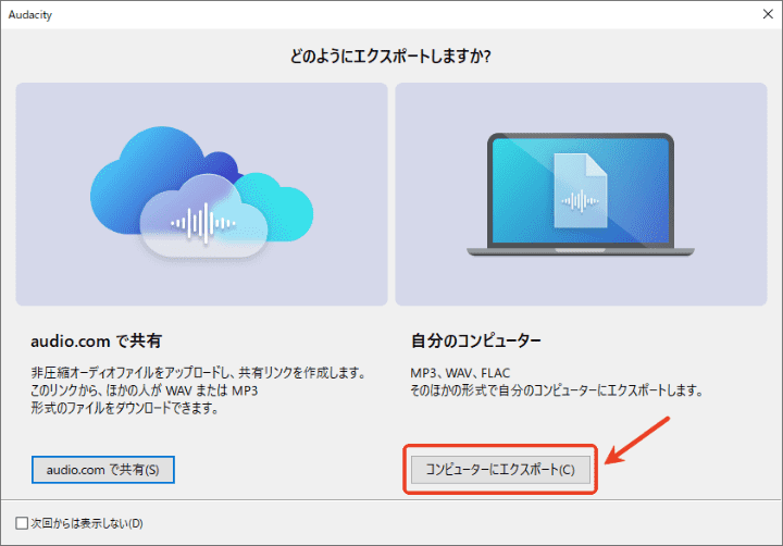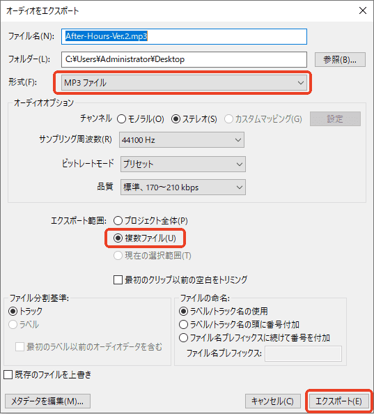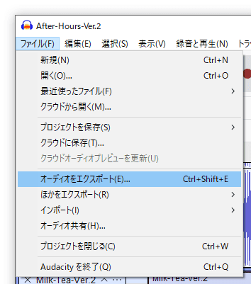 9.「ファイル」>「オーディオをエクスポート」をクリックします。