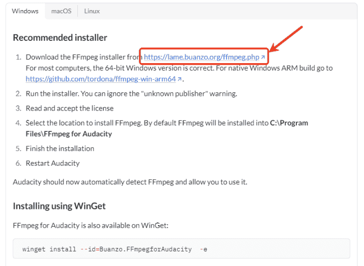 5.「Download the FFmpeg installer from」の後ろのリンクをクリックします。