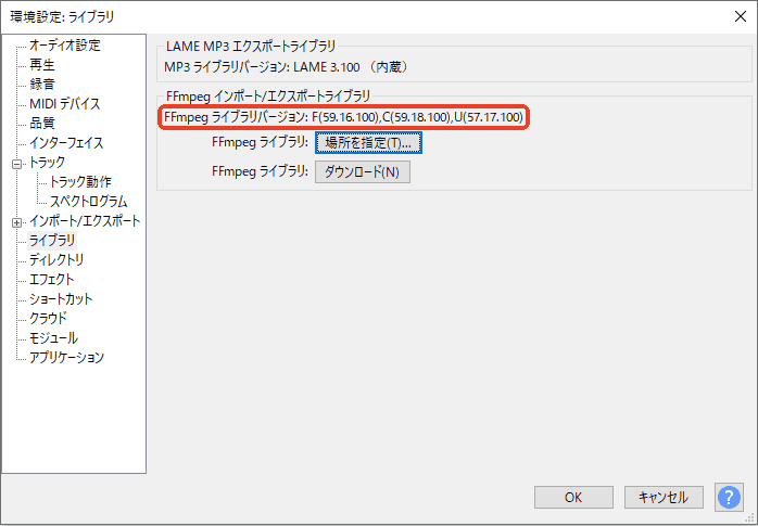 7.Audacityに戻り、もう一度「編集」>「環境設定」>「ライブラリ」に入ります。自動的に先ほどインストールしたFFmpegライブラリが検出されているはずです。検出されない場合は、「場所を指定」をクリックし、先ほど覚えたインストール場所を指定します。