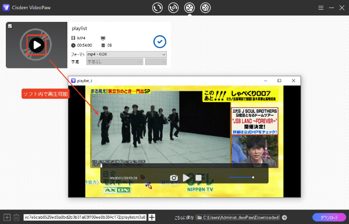 Cisdem VideoPawは、動画と音声のダウンロード、形式変換、圧縮、編集や、DVDのリッピングなどができるソフトです。9TSUだけではなく、YouTubeやニコニコ、TVer、Dailymotion、Twitter、Twitchなどの動画共有サイトにも対応できます。