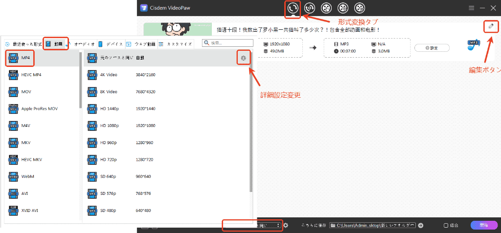 ステップ4. bilibili動画をMP4などのファイル形式に変換する