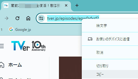 3. 好きなTVer動画ページに入り、そのURLをコピーします。