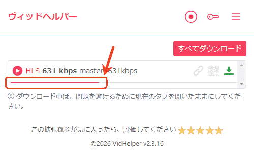 - 赤枠のところにダウンロード進捗が表示されます。