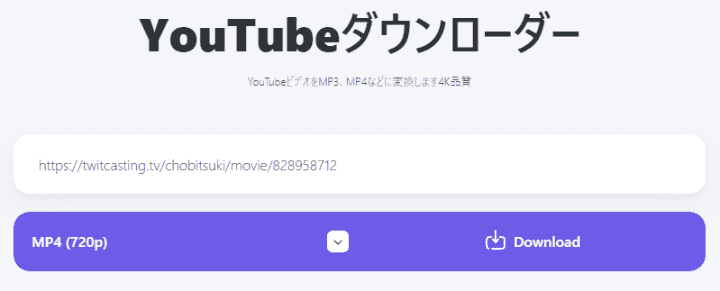 - ダウンロードしたいツイキャスのアーカイブのURLを貼り付け、「Download」ボタンをクリックします。