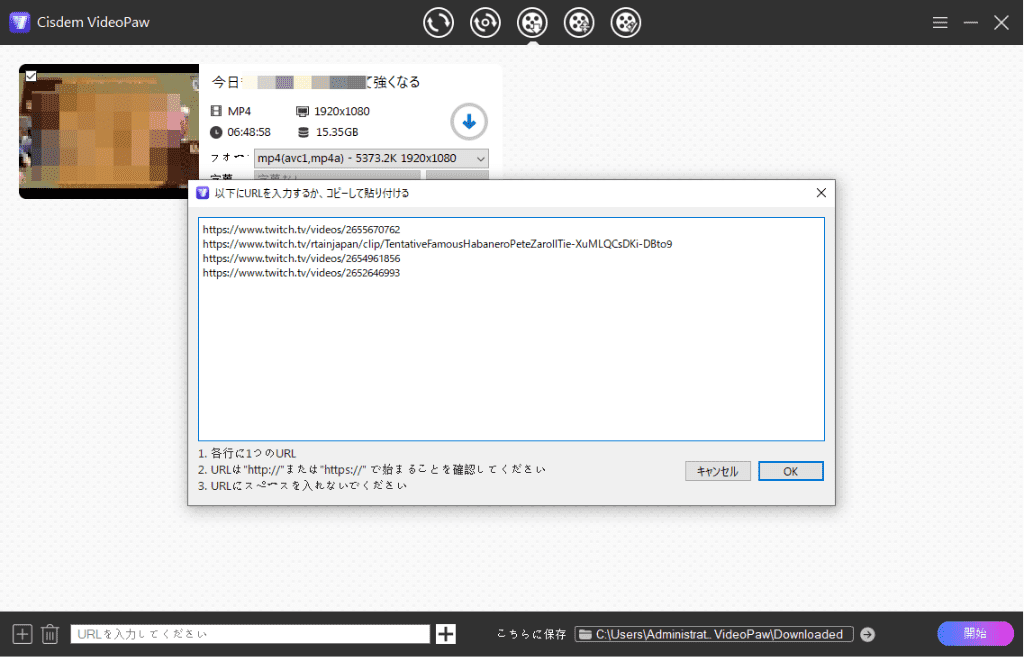 そしてポップアップされたウィンドウにURLを貼り付けて、「OK」で一括解析します。クリップにもVODにも対応可能です。一行に1つのURLだけ貼り付けてください。