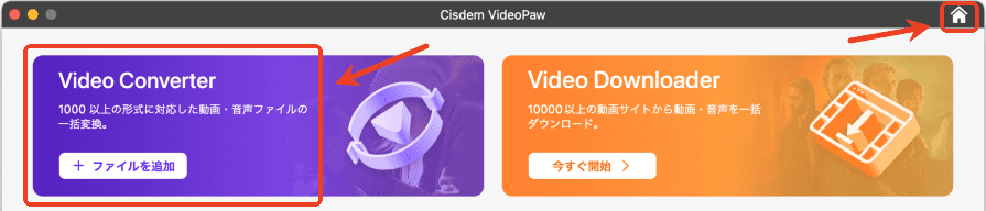 Mac版の場合、右上隅のホームアイコンをクリックしてメイン画面に戻り、そして「Video Converter」画面に入ります。
