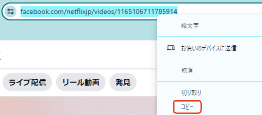 - 好きなFacebook動画のあるページに入ります。上記のURL欄でそのURLをコピーします。