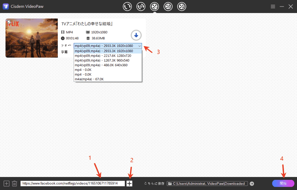 Cisdem VideoPawは、Facebook、X(Twitter)、YouTube、ニコニコ、Tverなど1000+の動画共有サイトから動画をダウンロードできるソフトで、動画/音声形式変換、動画結合、動画編集、DVDリッピングなどの機能も搭載しています。たくさんのFacebook動画をダウンロードする必要がある場合に最適のソフトです。