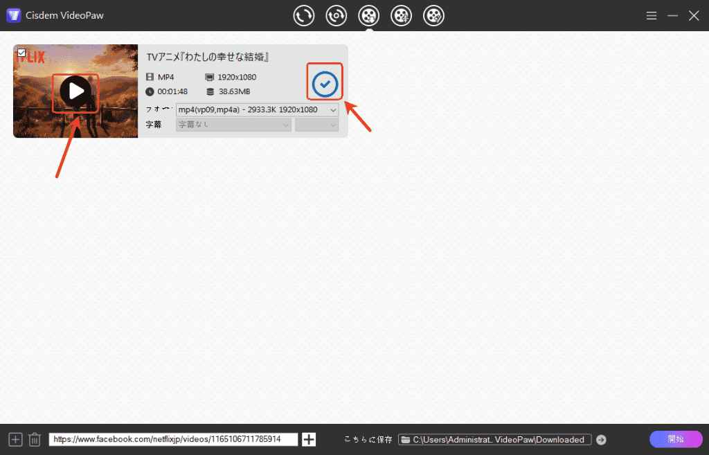 - ダウンロード完了した動画に再生ボタンが表示されます。クリックすればアプリ内で再生できます。その右のチェックボタンをクリックすれば動画の保存場所を開くことができます。