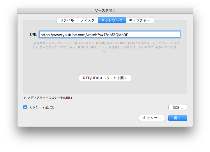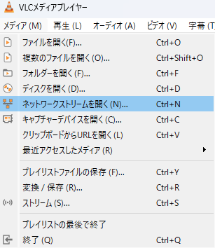 - VLCを開いてメニューバーで「メディア」 > 「ネットワークストリームを開く」をクリックします。