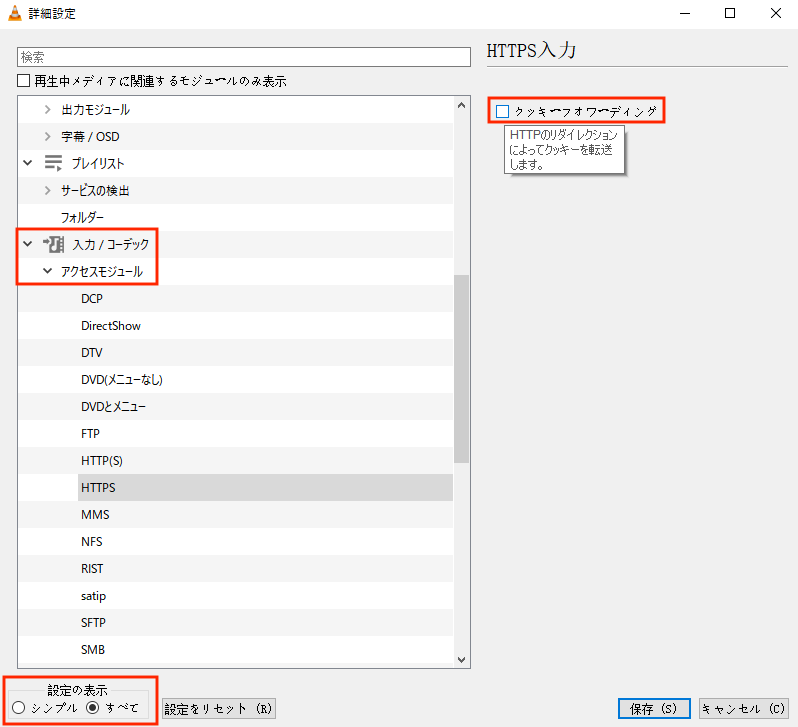 - ターゲットは新しいウィンドウの左パネルにあります。「入力/コーデック」 > 「アクセスモジュール」 > 「HTTPS」をクリックします。それから右側の「クッキーフォワーディング」を無効にします。