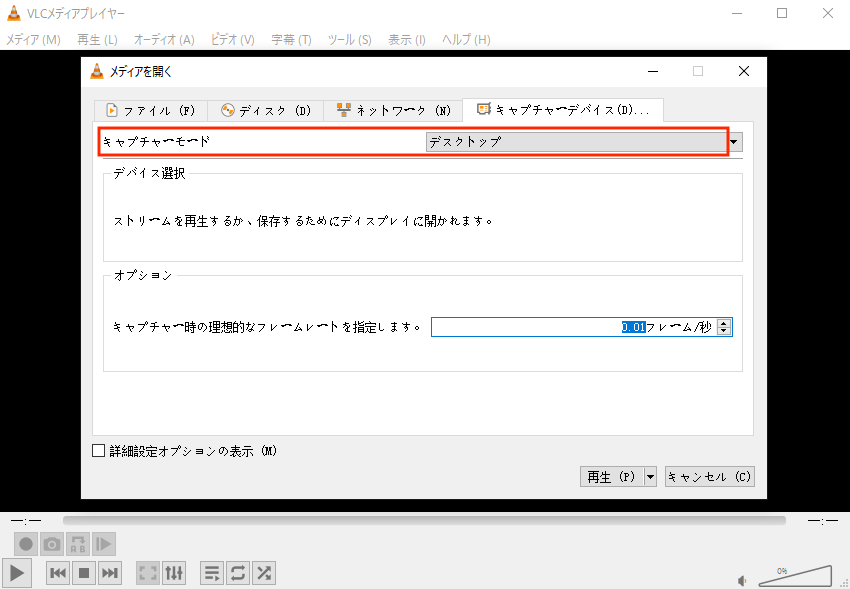 - 録画設定ダイアログで「キャプチャーモード」の右側のプルダウンメニューから「デスクトップ」を選択します。フレームレートも設定できます。