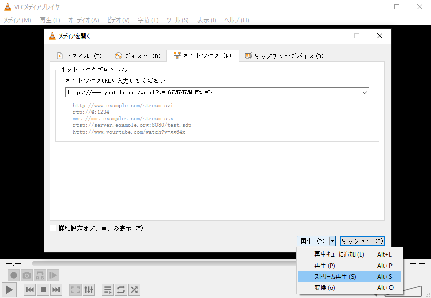 - 底部の「再生」ボタンのプルダウンマークをクリックして「ストリーム再生」を選択します。