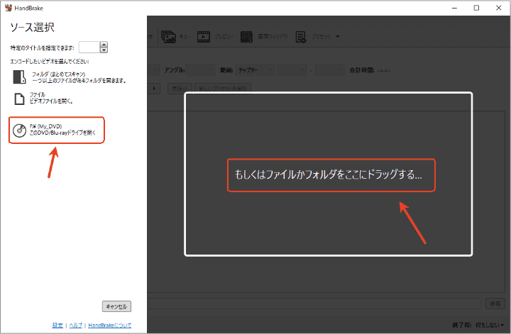 - HandBrakeをインストールして起動します。左カラムの「ソース選択」のところで接続しているDVDが表示されるはずですのでクリックします。表示されない場合、ドラッグ&ドロップでDVDを右カラムの「もしくはファイルかフォルダをここにドラッグする」のところに追加します。