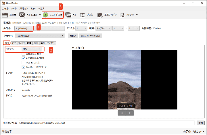 - 最後は3の「エンコード開始」をクイックすればDVDをリッピングできます。