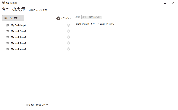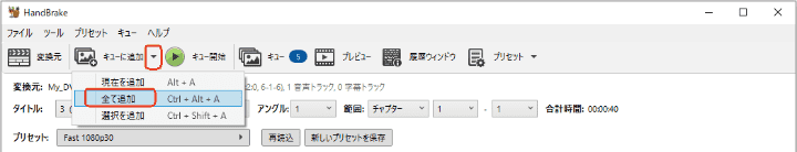 - 複数のDVDを一括でリッピングしたい場合は、「キューに追加」>「全て追加」をクリックして、すべてのタイトルをキューに追加します。すると「キュー開始」をクリックして一括変換します。